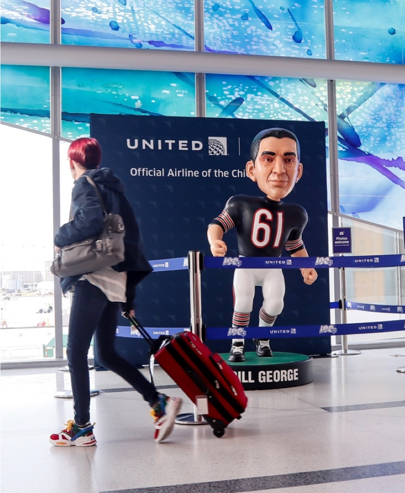 We dressed the iconic Brachiosaurus skeleton in Concourse B in an oversized Bears jersey — the kind of stunt that stops a city in its tracks. Gate signs across Terminals B and C were wrapped to look like jerseys. A life-sized Bill George bobblehead anchored a season-long photo opportunity. Player appearances brought it to life throughout the year. Every touchpoint was designed to ignite the passion of Chicago sports fans the moment they walked through the door.